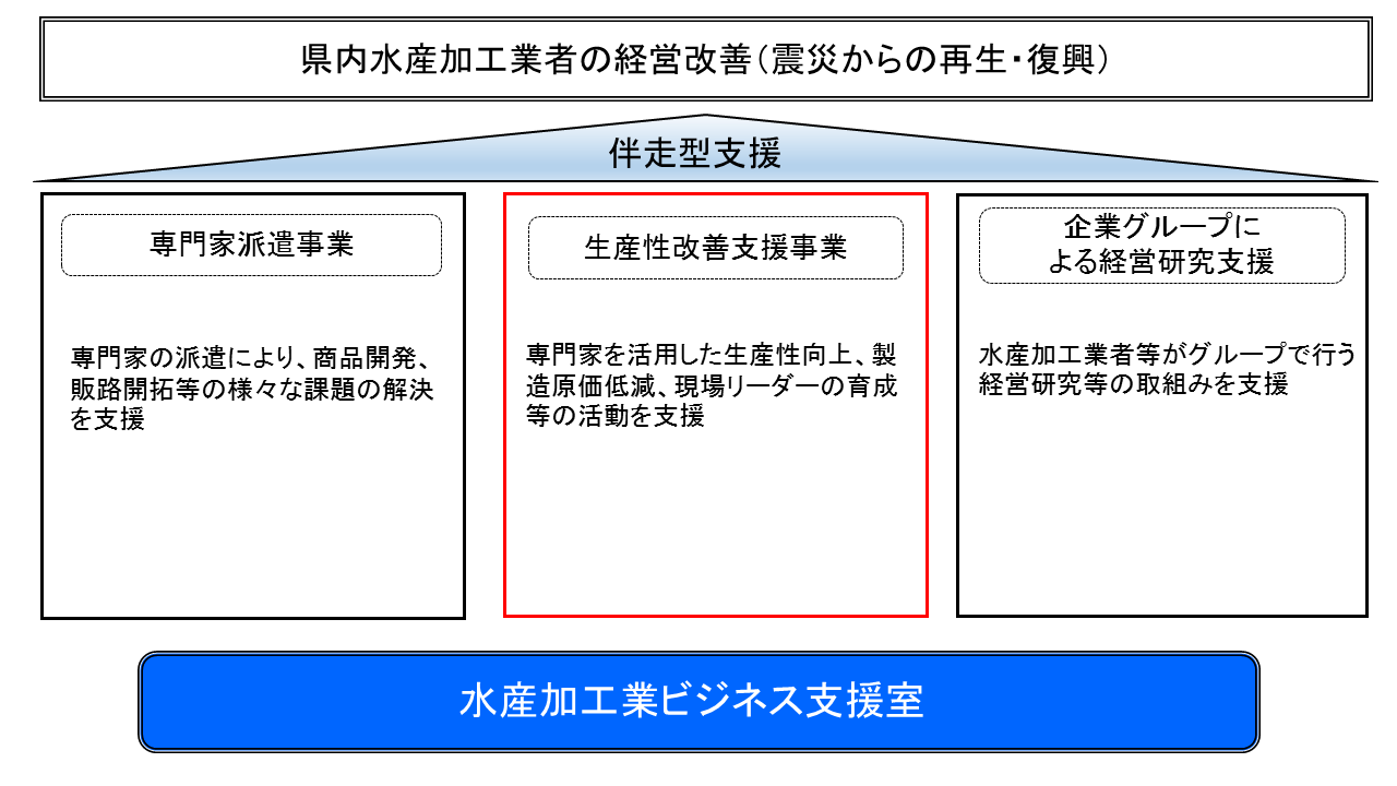 ・水産加工業者が専門家を活用して取組む生産性向上、製造原価低減、現場リーダーの育成等の活動を支援するもの。